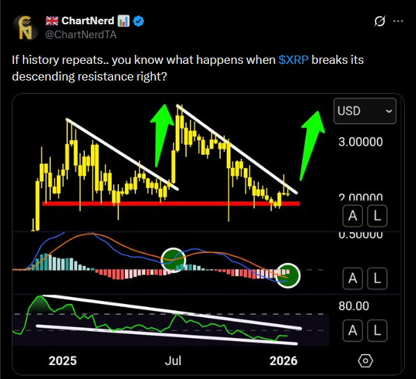 XRP价格目前正处在一个交易者密切关注了数月的熟悉技术结构中。根据ChartNerdTA在X平台发布的图表,近期价格走势在长期受考验的2美元支撑区域附近收窄,同时反复测试一条下降阻力线。