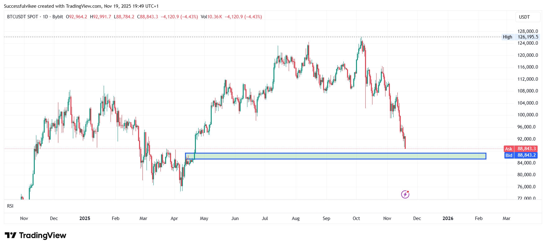 我们将比特币置于末位,因为它已超越传统加密货币范畴。如下图所示,价格正从蓝色矩形标注的需求区形成看涨反弹结构: