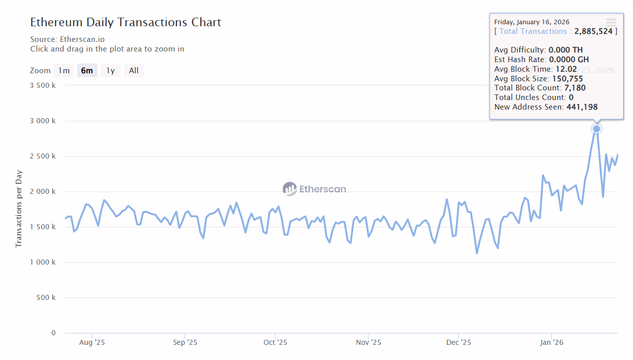 除技术指标外,以太坊的链上数据提供了另一层佐证。1月16日,该网络单日交易量达到288万笔,创下以太坊历史上最高的单日交易记录。即便价格处于区间震荡,这一活跃度的飙升仍凸显出市场对区块空间、去中心化应用及结算的持续需求。