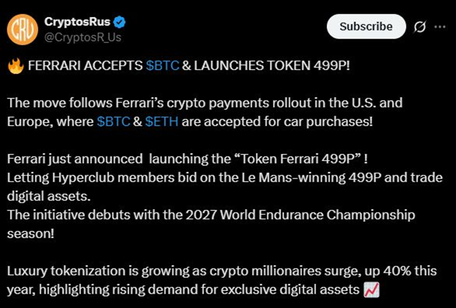 该举措凸显奢侈品代币化的新趋势——通过将限量版跑车等资产代币化,品牌方可制造稀缺性营销效应。值得注意的是,法拉利自2023年起就已接受加密货币购车(需通过第三方即时法币兑换),此次代币发行是其加密布局的深化。