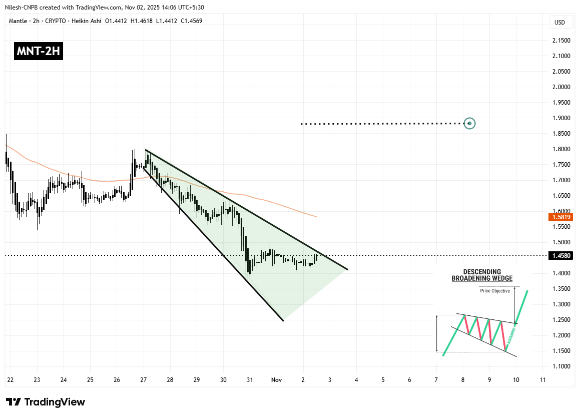 在近期回调过程中,MNT曾测试1.3784美元附近的楔形下轨支撑,买盘在该区域积极防御。此后代币强势反弹,目前已回升至1.4580美元附近,正逼近楔形上轨阻力线。