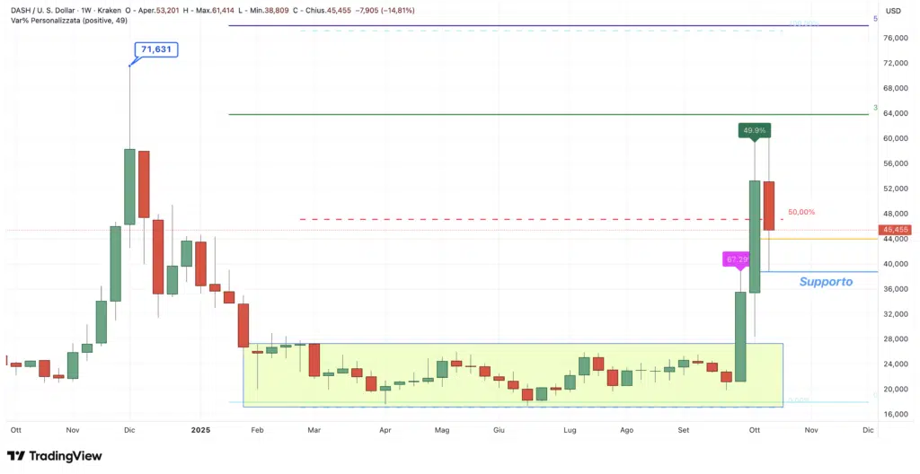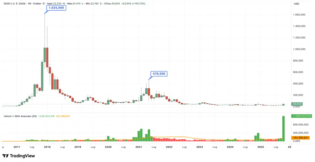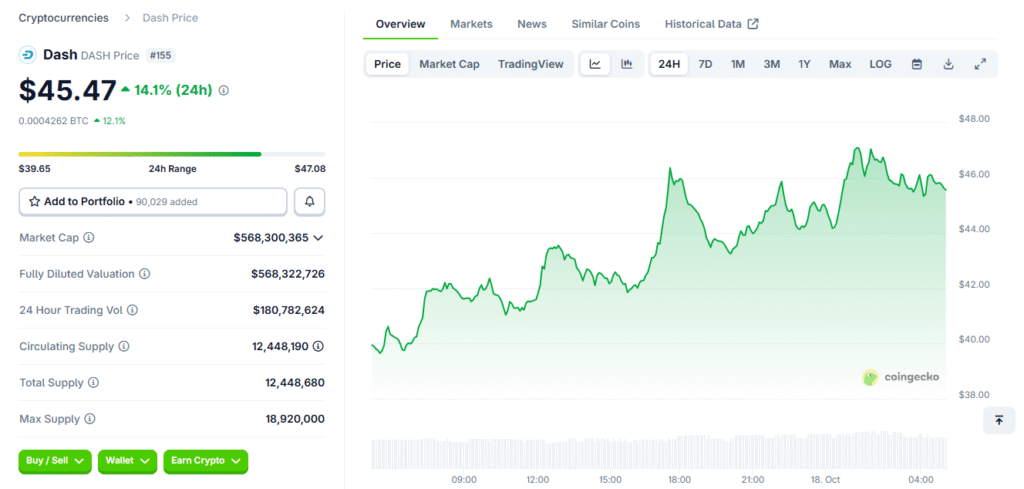 在经历强劲反弹后,达世币(DASH)10月累计上涨104%,截至发稿时报45.76美元。该加密货币突破38.50美元关键阻力位,创纪录的交易量数据进一步验证了看涨趋势。