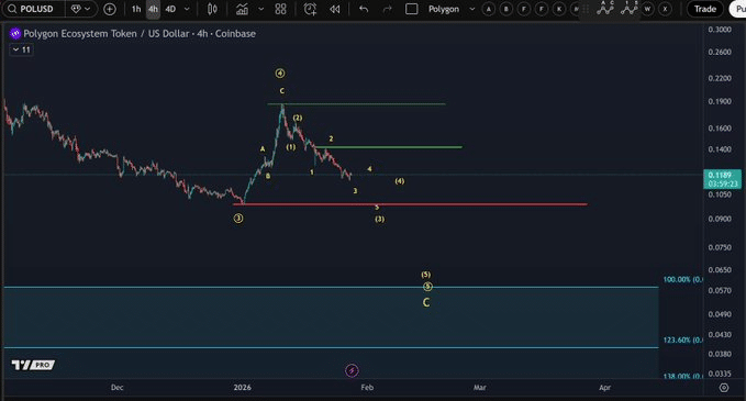 More Crypto Online分享的技术观点认为当前结构在技术上尚未完整。分析师指出POL仍处于更广泛的艾略特波浪修正形态中,近期反弹应视为逆趋势波动而非趋势反转。