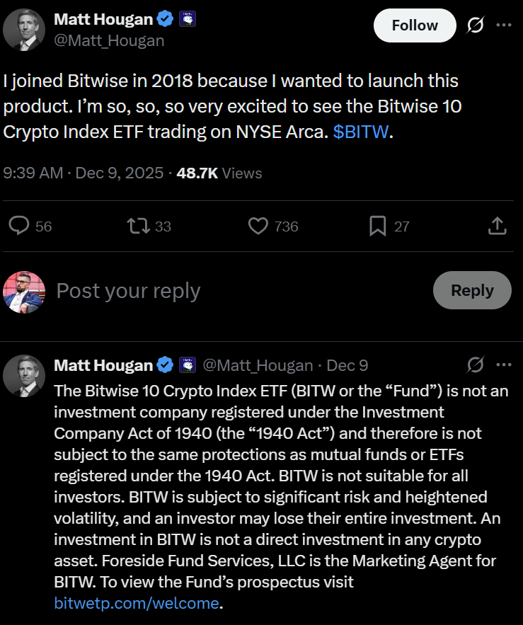 12月10日,Bitwise资产管理公司的10大加密货币指数基金(BITW)从场外市场转至纽交所Arca平台交易,提升了市场能见度并为更多机构参与开启大门。该基金现已作为交易所交易产品面向市场。