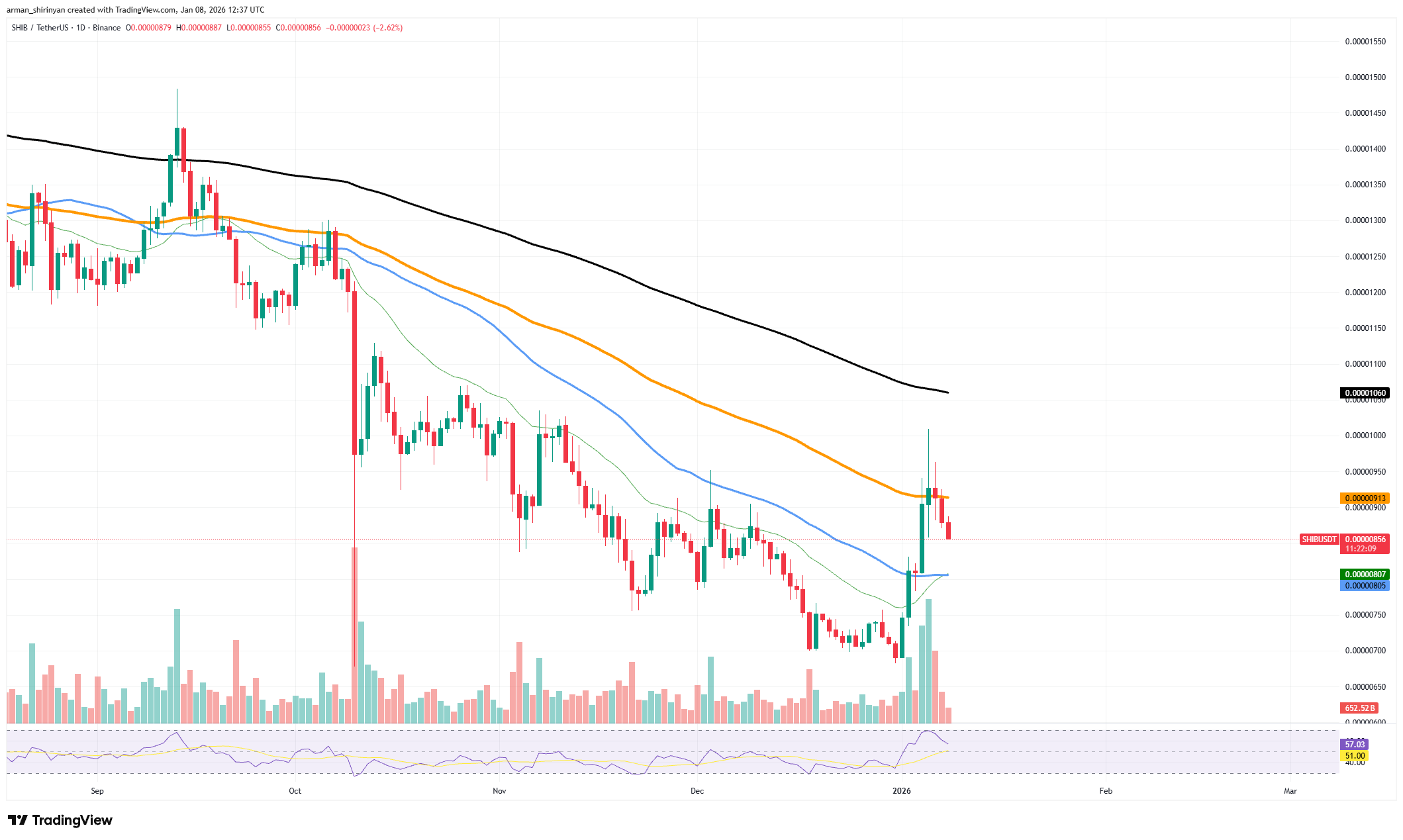 当价格停滞于百日指数移动平均线时,卖方强力介入彻底终结了平稳复苏的可能性。从更广义的技术角度看,SHIB仍困于下行结构中。动量指标显示市场呈现犹豫态势而非走强信号,图表上持续出现更低的高点。