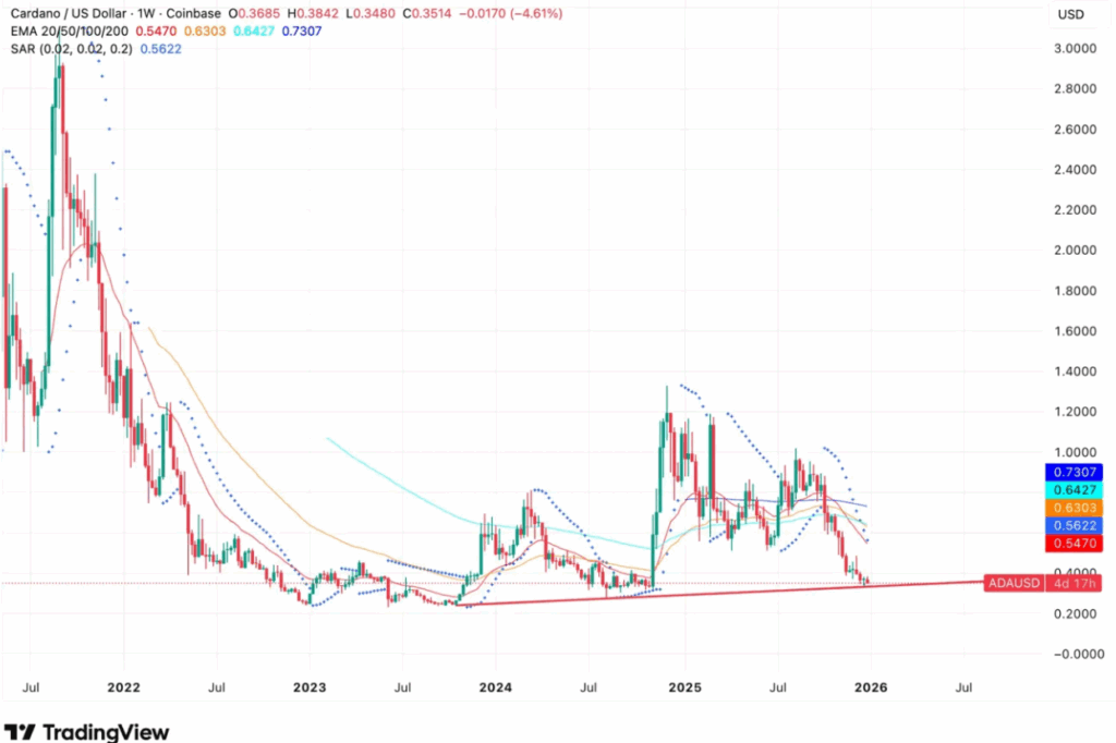 卡尔达诺($ADA)在2025年经历了充满挑战的一年,价格徘徊在0.35美元附近,12月31日下跌4.61%。该加密货币在0.73美元关口面临强劲阻力,但2026年的重大进展可能改变ADA的走势。其中最受期待的变革包括午夜协议主网上线,以及卡尔达诺创始人Charles Hoskinson与索拉纳联合创始人Anatoly Yakovenko的开创性合作。这些发展有望解决区块链生态的碎片化问题,释放海量流动性并提升ADA的价值主张。