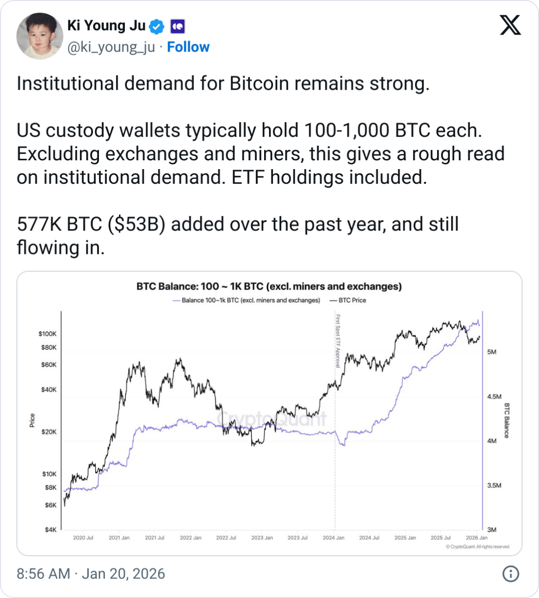尽管当前监管环境趋于利好,部分分析人士担忧未来若政策风向转变可能影响机构情绪。近期数据显示,机构基金在过去一年累计增持57.7万枚比特币(约合530亿美元)。