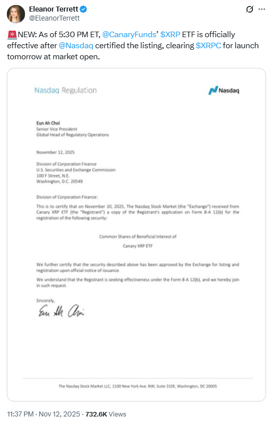 纳斯达克交易所于2025年11月10日收到8-A 12(b)表格后,批准了代码为XRPC的金丝雀瑞波ETF上市。瑞波资讯显示,该投资工具于11月13日开始交易,成交量创下纪录。