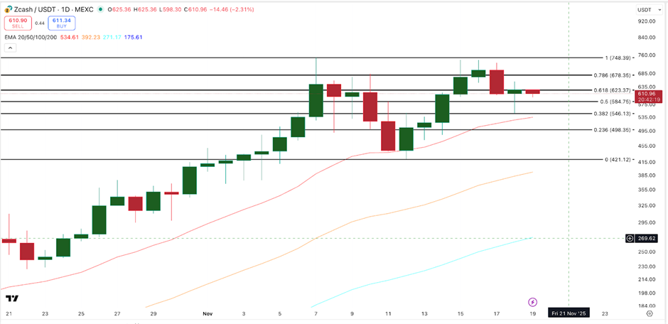 市场对此反应迅速:ZEC近三个月暴涨近1500%,成为加密货币市场表现最强劲的资产之一。在触及748美元高点后,目前进入缓慢整理阶段。