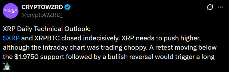 换言之,XRP鲸鱼活动依然疲软。但有分析师对后续走势提供指引,例如基于XRP/BTC图表的XRP技术展望显示其收盘于犹豫区间内。分析师CryptoWZRD指出,若瑞波币保持在2美元上方将释放积极信号,届时XRP价格可能积聚更多看涨动能并上探2.70美元。