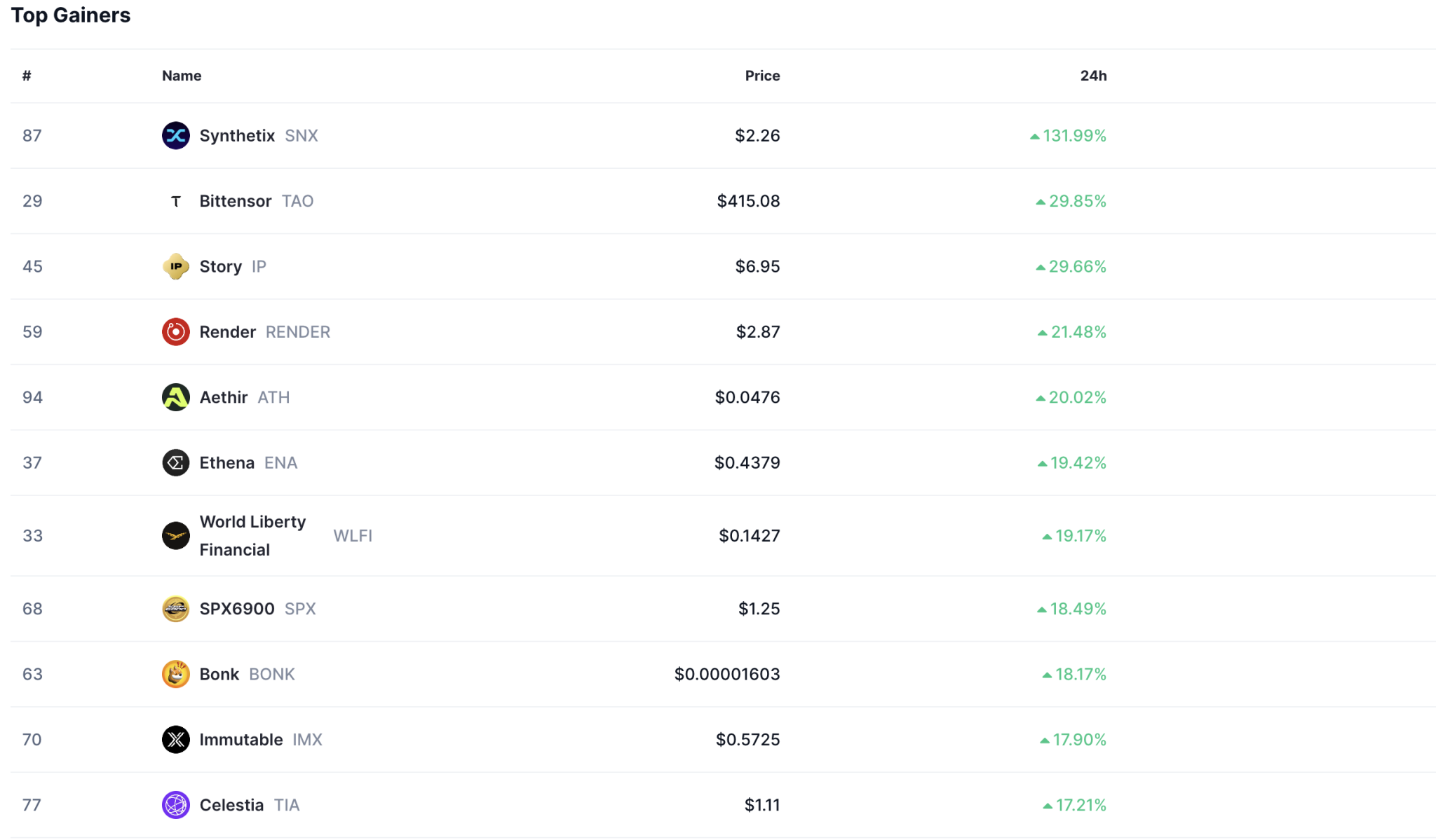 CoinMarketCap数据显示,SNX以超120%的惊人涨幅领跑榜单。Bittensor(TAO)以29.8%的涨幅紧随其后,Story(IP)则以29.6%的涨幅位列第三。Render(RENDER)、Aethir(ATH)和Ethena(ENA)分别实现21.4%、20%和19.4%的涨幅。