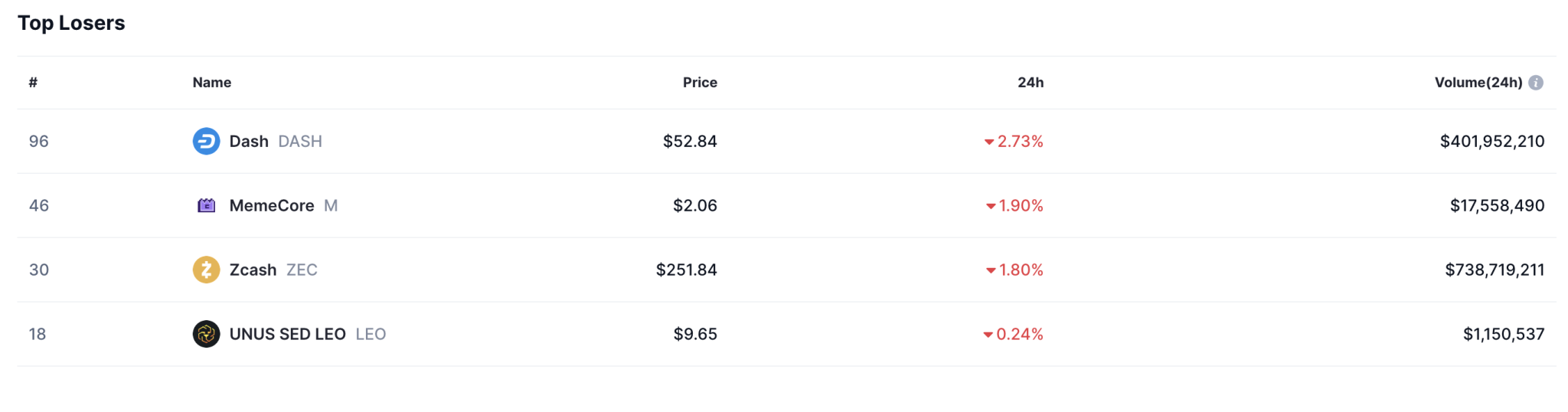 同期跌幅最大的币种中,达世币(DASH)以2.7%的跌幅居首,MemeCore(M)和Zcash(ZEC)分别下跌1.9%和1.8%位列二、三位,LEO则以0.2%的微弱跌幅垫底。