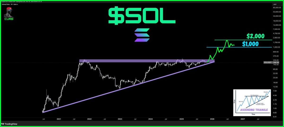 交易员Curb指出,SOL目前处于高位时间框架的上升三角形形态,通常是看涨信号。他给出该形态的两个长期目标价位:1,000美元和2,000美元。