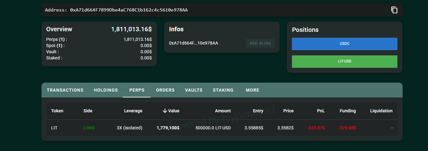 近期链上数据呈现有趣变化。标签为0xA71d的钱包于约8小时前向HYPE存入181万枚USDC,并开设500,000 LIT的3倍多头仓位,价值约183万美元。