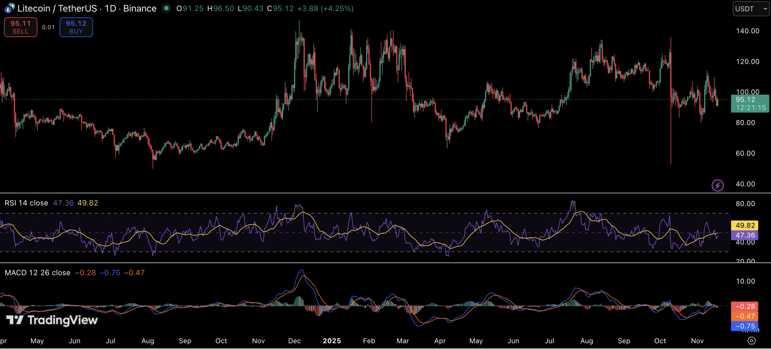 • 莱特币现价95美元附近震荡,动能中性,88-105美元区间窄幅波动