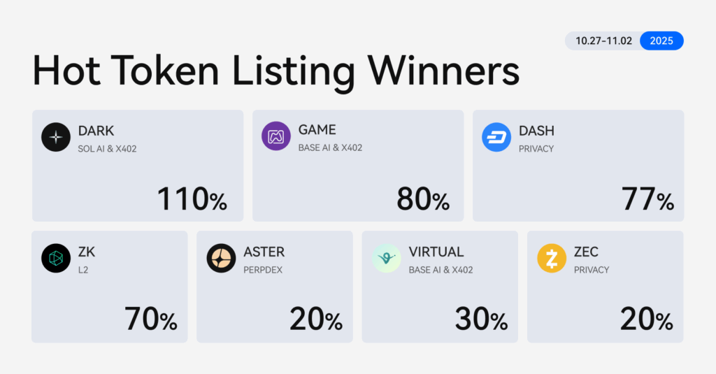 整体而言,AI与隐私成为本周推动市场修复的两大主力。前者代表对创新边界与效率提升的开拓,后者则象征着对去中心化理念的坚守与复兴。从DARK的爆发式上涨到DASH、ZEC的王者归来,市场正在见证新旧叙事的交汇与共振。