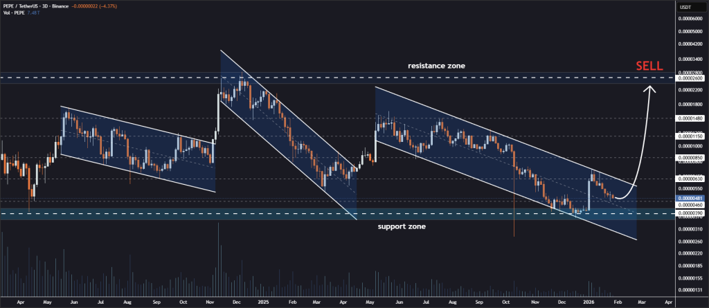 在三日时间框架上,PEPE的价格始终保持在下降通道的中线之上。