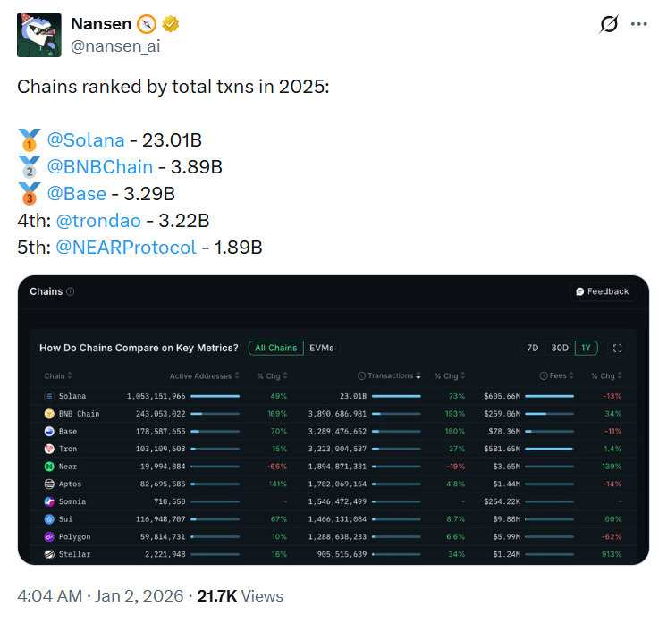 链上分析公司Nansen将Solana、BNB Chain、Base、Tron和NEAR Protocol列为2025年最活跃的区块链网络。