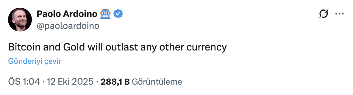 在上周末一份简洁而有力的声明中,Ardoino断言:"比特币和黄金将比任何法定货币更持久。"该表态主要面向密切关注泰达储备构成的机构和个人投资者。此番言论发布之际,正值市场波动加剧引发避险资产关注度攀升的一周。