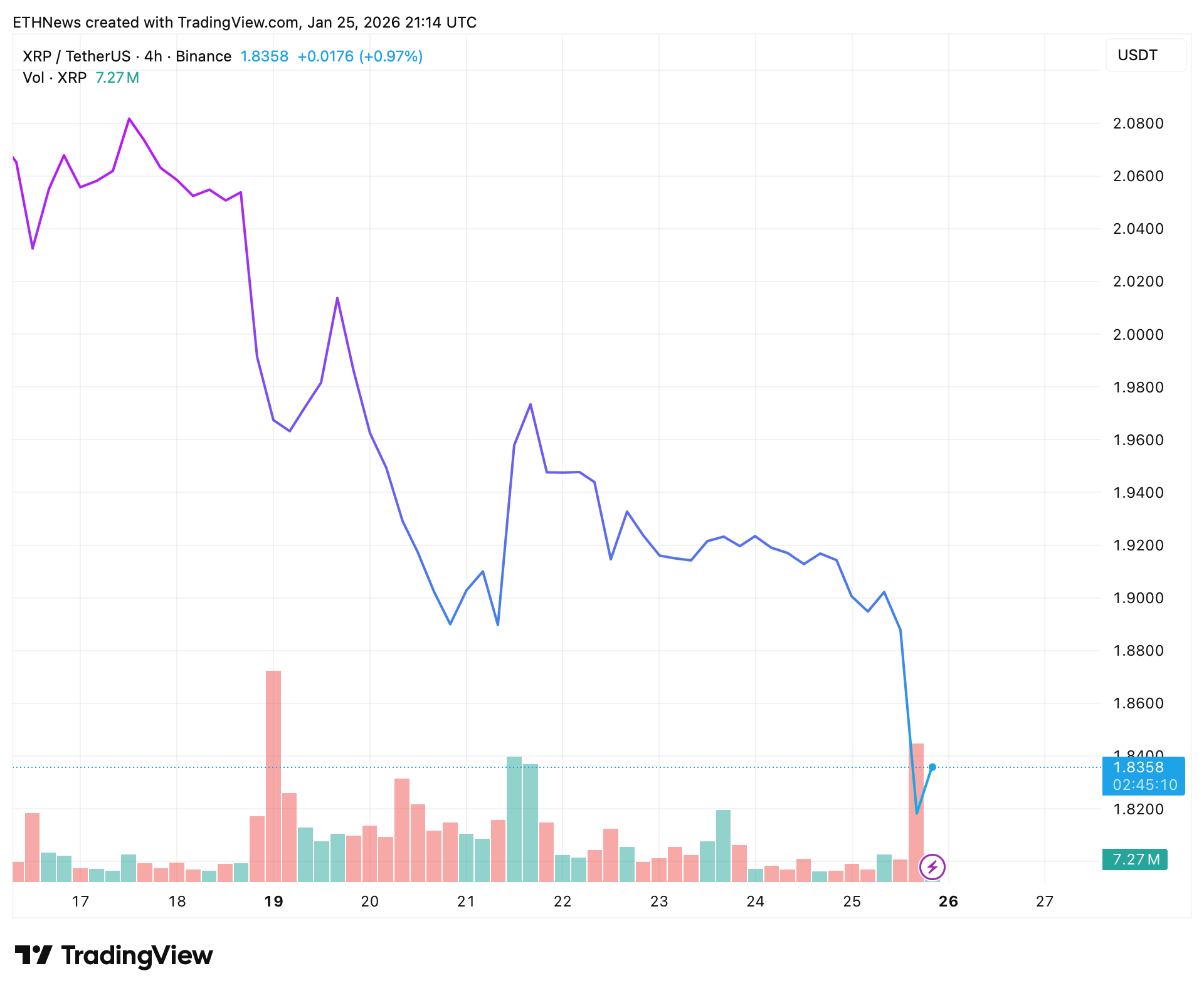 XRP近期的价格走势反映出明确的结构性弱势。本周初未能维持高位后,代币遭遇急剧抛售,随后在1.82–1.84美元区间附近趋稳。