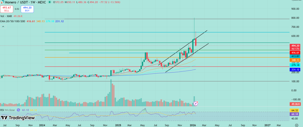 随着加密货币市场整体降温,隐私币在比特币回调带动下普遍承压。经历数周强势上涨后,门罗币价格动能骤减,单日跌幅超过15%,并失守500美元关键支撑区域。此番波动使市场情绪从谨慎乐观转向警惕,交易者开始重新评估近期涨势究竟属于高位整理还是结构转弱,而当前回调发生的位置尤为值得关注。
