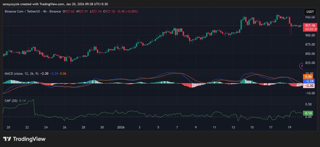 BNB的移动平均收敛散度指标线位于零线下方,表明动能疲弱。但信号线仍处于零线上方,显示短期动量有所改善。在此格局下,看跌压力依然存在,并出现初步盘整迹象而非强烈下跌趋势。