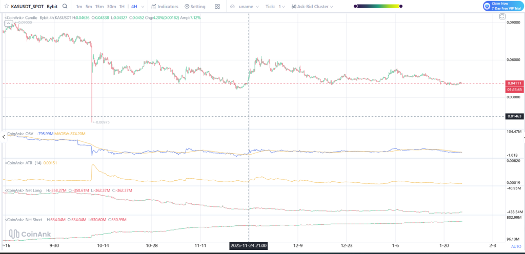 在那次重大破位后,KAS价格曾尝试反弹至0.060美元区域,但未能维持。自那时起,价格一直以受控且稳定的方式走低。过去几周,KAS一直在0.040至0.046美元之间横向盘整。目前,价格正位于该区间的下端附近。卖方并未将其压至更低,但买方也尚未强势入场。