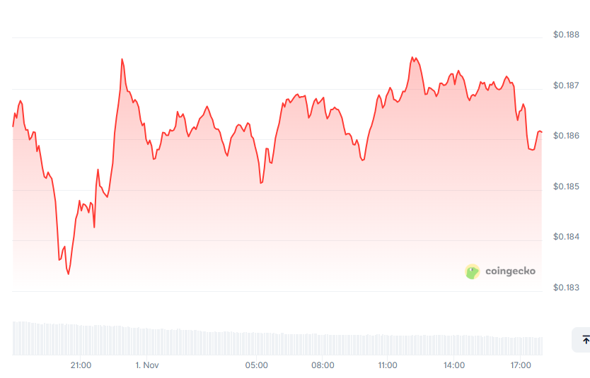 狗狗币短期走势保持稳定,现报0.1861美元,日内微涨0.58%,市值约282.1亿美元。即便24小时交易量收缩51%,市场基调仍显平稳。0.183-0.187美元价位更应被视为盘整而非恐慌性抛售。