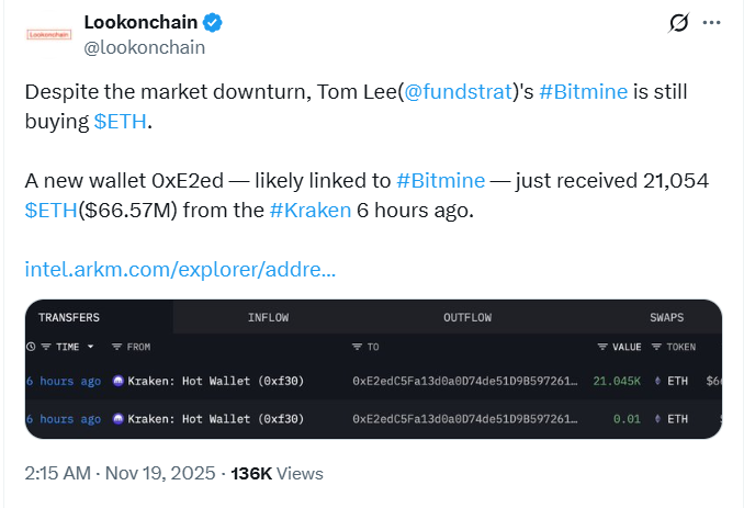 尽管市场疲软,Tom Lee的BitMine仍持续加仓以太坊。链上数据显示,与该机构关联的新钱包从Kraken接收了21,054枚ETH。这笔转账发生在早盘时段,正值以太坊价格接近关键支撑区域。