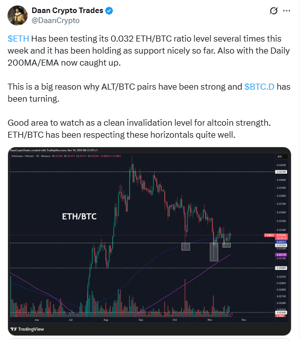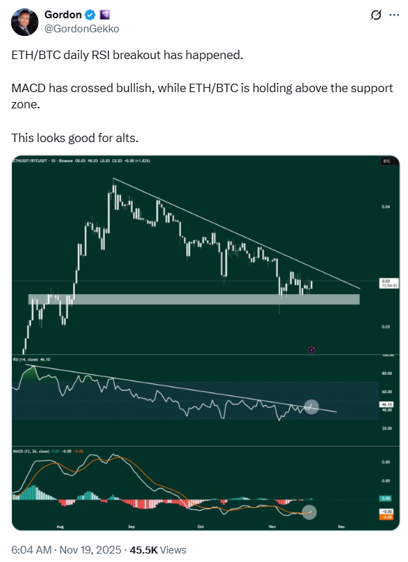 ETH/BTC汇率本周多次测试0.032支撑位,日线200MA与EMA亦汇聚该区域形成强化支撑。图表显示RSI出现突破信号,MACD形成金叉,该货币对始终维持在分析人士标注的支撑区间上方。