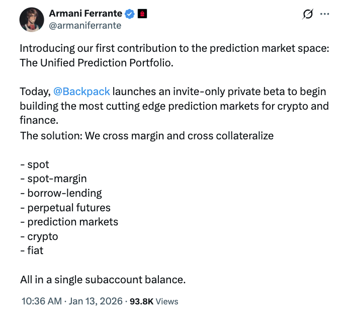 该交易所已启动名为“统一预测投资组合”新平台的封闭测试版。Backpack首席执行官阿玛尼·费兰特于周二在社交平台X上发文公布了这一进展。