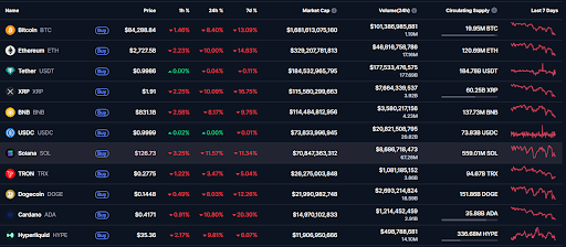 加密货币市场今日呈现看跌趋势,比特币在过去一周下跌13.09%。以太坊同期下跌14.83%,现报2,727.58美元。瑞波币周内跌幅达16.75%,Solana过去24小时重挫11.57%。市场普遍呈现下行态势,多数代币触及数月低点。