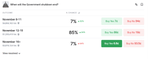 美国参议院近日以60-40的投票结果通过跨党派协议,拟为关键部门提供延续至明年的资金,该方案正移交众议院审议并将提交总统签署。去中心化预测市场Polymarket的交易者普遍认为,停摆将于本周内结束——在过去24小时内,预测"明日之前解决"的合约赔率持续走低,85%的交易者押注停摆将在11月12日至15日期间终结。