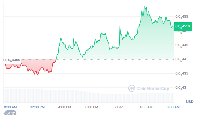 早盘交易中PEPE一度接近0.00004399美元,随后买盘介入。价格随后形成更高的低点,并向0.0000455美元推进,在该位置形成短暂高点后进入温和整理。这一形态显示出稳健攀升态势,而非剧烈波动。