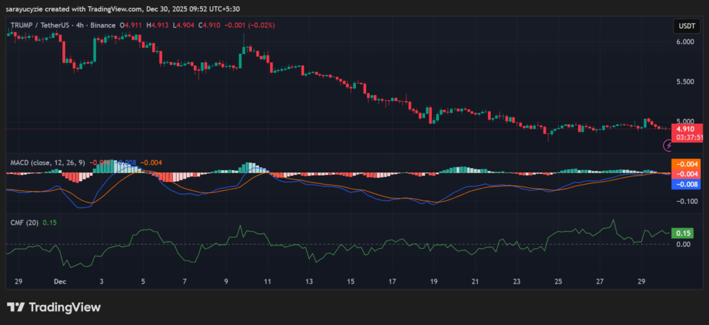 OFFICIAL TRUMP 目前交易价格接近 4.90 美元水平。市场呈现犹豫不决的状态,并未形成明确的下行趋势。市场 2.96% 的跌幅导致加密货币普遍陷入震荡。随着价格波动加剧,图表被染上了一片血红。强劲的看跌压力日复一日持续增强,使资产动能不断下行。与此同时,OFFICIAL TRUMP (TRUMP) 录得 2.51% 的价值跌幅。