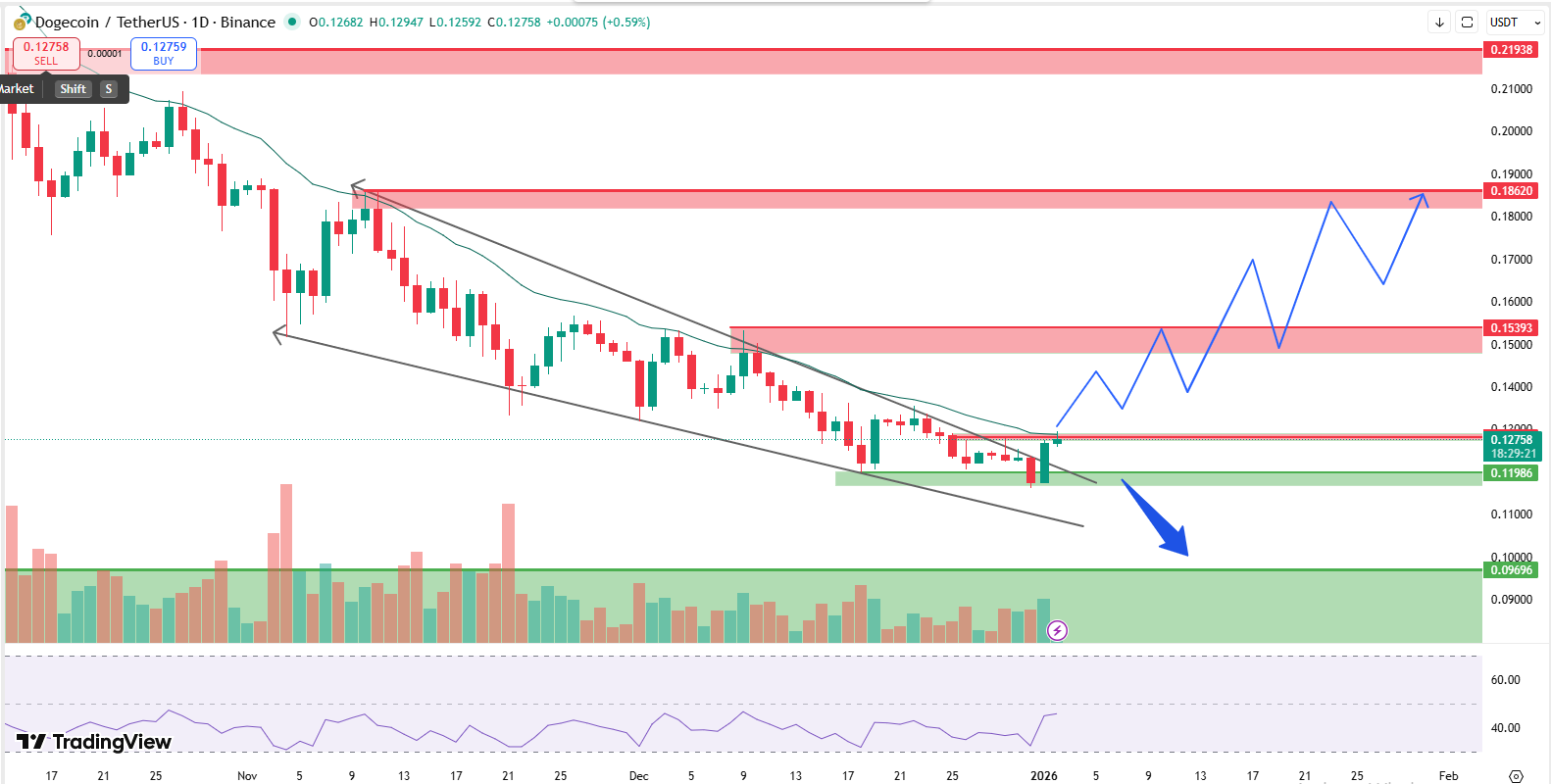 转机出现在0.12000美元关口。价格短暂下破该位置清退弱势多头后,迅速以放量姿态突破下降趋势线,更成功站稳于100日EMA上方——这是此前未曾出现的积极信号。RSI指标从超卖区域回升至63附近,配合放大的成交量,共同印证动能增强。