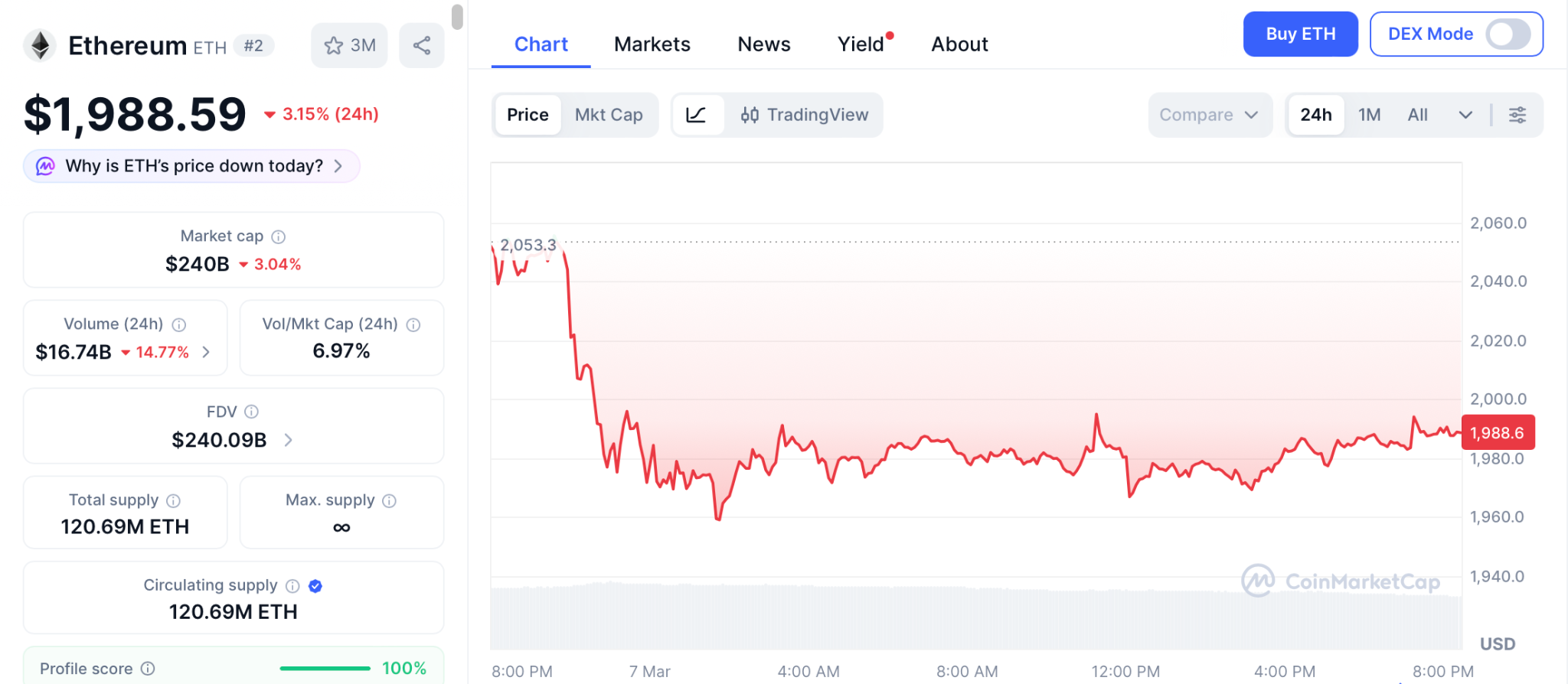 据CoinMarketCap数据,ETH曾反弹25%至2200美元,目前回落至1988美元。尽管净持仓量转为正值且ETF单日流入1.69亿美元,但2100美元仍是关键支撑位。以2500亿美元市值计算,即使涨至2500美元也仅带来14%涨幅,而下一个爆发的加密资产将提供以太坊当前水位无法企及的倍增空间。