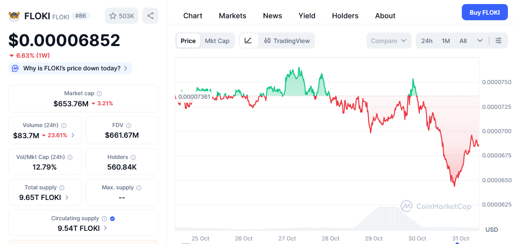 截至10月31日,FLOKI报价0.000006852美元,周跌幅6.63%。
