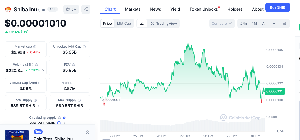 10月30日数据显示,Shiba Inu周涨0.66%至0.00001010美元。