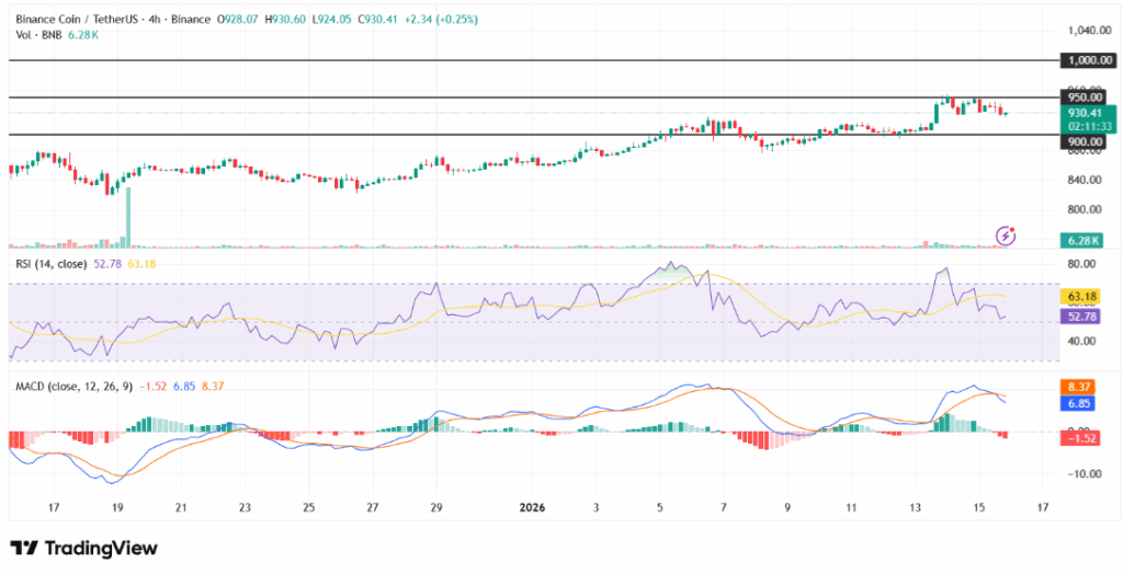 从日内表现来看,截至2026年1月15日数据,BNB近四小时微涨0.21%,交易价格稳定在939美元附近。该加密货币近期呈现一定波动性,先后突破900美元阻力位并上探950美元区间。相对强弱指数现报64.36,表明BNB正接近超买区域,而移动平均收敛散度指标仍保持正值,显示市场买压持续存在。