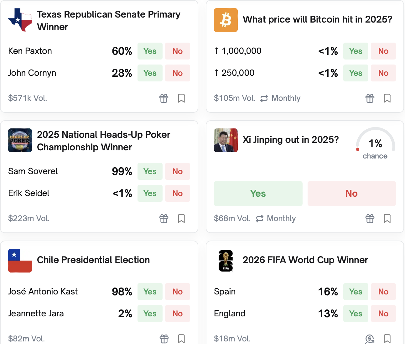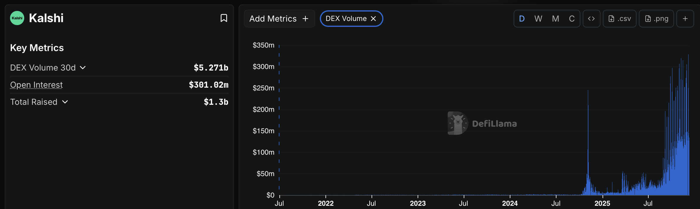 预测市场已成为2025年的重要趋势。DefiLlama数据显示,预测市场平台Kalshi过去30天交易量达52.7亿美元,而基于区块链的Polymarket同期交易量接近20亿美元。