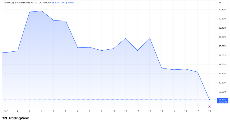 反映比特币占加密货币总市值份额的比特币主导指数(BTC.D)在2025年11月从61%上方跌至58.8%。分析师认为这一技术破位可能成为市场转向的关键信号,预示着山寨币或将迎来上涨周期。