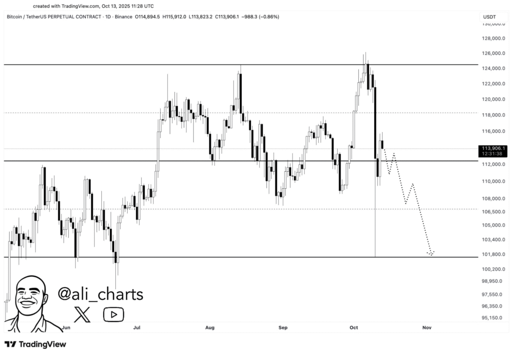 比特币价格近期显现下行趋势,已脱离11.5万美元支撑区域。TradingView分析师Ali Martinez的最新图表分析表明,加密货币可能延续看跌动能。目前比特币交投于113,900美元附近,由于未能守住11.5万美元关口,部分分析师预测其或将重新测试10万美元心理位。