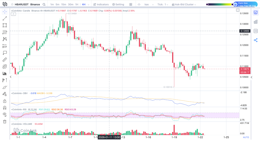 由此向上,第一个关键阻力区域在0.115美元至0.118美元附近。如果HBAR能够突破并站稳该区域,将表明短期结构开始转向,为价格打开通往0.125美元乃至重返0.13美元区域的大门。若价格能成功收复这些水平,那么谈论向0.20美元迈进就不再只是空想,而是更具现实基础。
