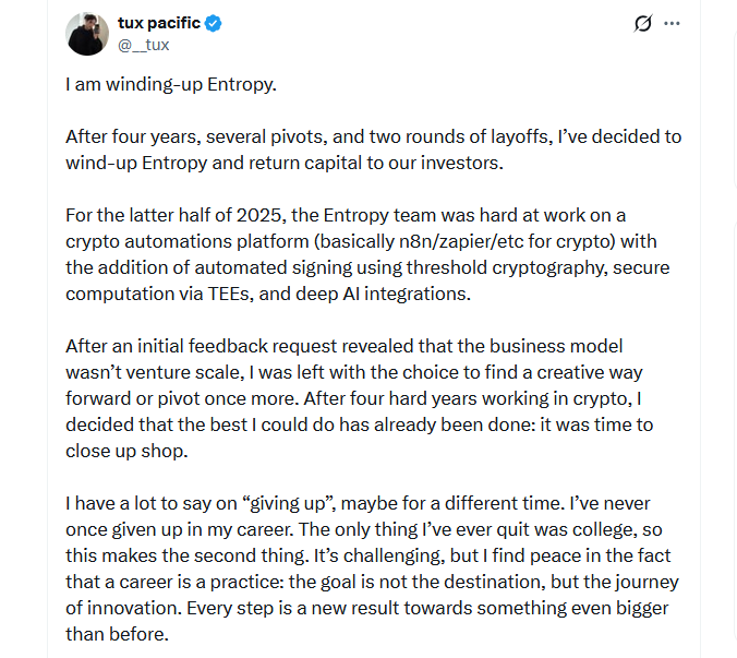 加密自动化平台Entropy因规模扩张困难及未能找到产品市场契合点,决定停止运营并向投资者返还资金。公司创始人兼首席执行官塔克斯·帕西菲克于周六在社交平台X上发文称,经过多年经营,该平台已无法找到可行的发展路径。