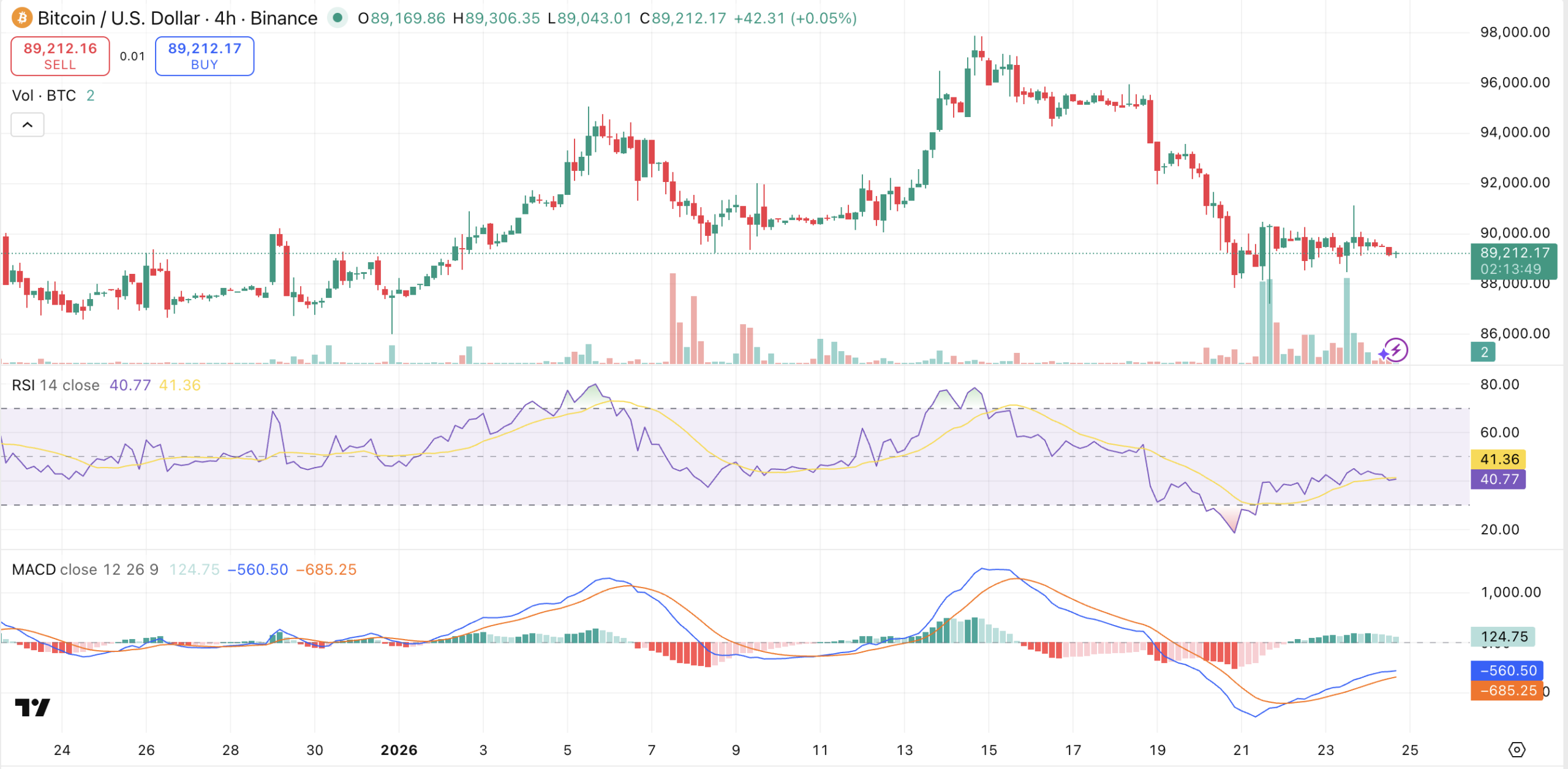 在4小时图表中,比特币现报价89,200美元附近,方向性动量有限。相对强弱指数略高于40,从超卖区域小幅回升,但仍远低于趋势加速所需的水平。与此同时,MACD指标虽仍为负值,但已显现走平迹象,表明看跌动能可能减弱而非增强。