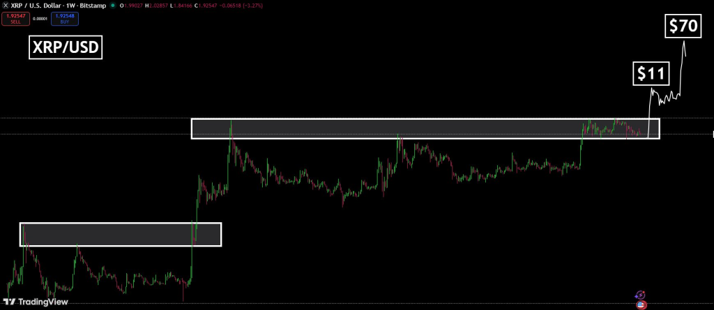 技术逻辑并非预示XRP将直冲70美元,而是指向分阶段行进:首轮走势瞄准11美元作为积累后的初次扩张,仅此波动便足以颠覆当前价格格局并引发市场情绪转向,后续更高目标位的冲击才可能提上议程。