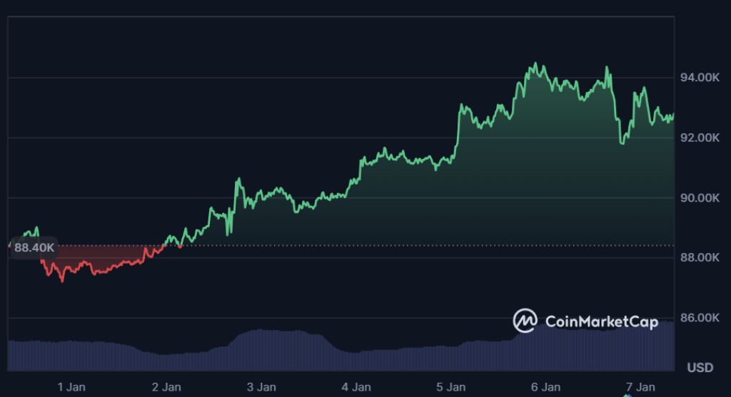 比特币在新年伊始展现出强劲势头,但过程并非一帆风顺。昨日价格短暂跌破92,000美元后迅速收复失地,并将其重新转化为短期支撑。目前比特币交易价格约为92,700美元,正从本周早些时候接近94,500美元的阻力位回撤中恢复。