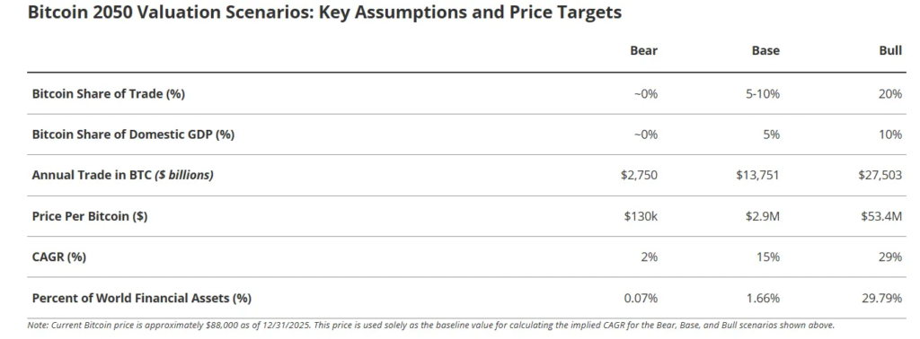 根据该公司的预测模型,此目标价格基于15%的年增长率设定。在此情境下,到2050年,比特币将结算全球贸易的5%至10%,以及大约5%的国内交易。