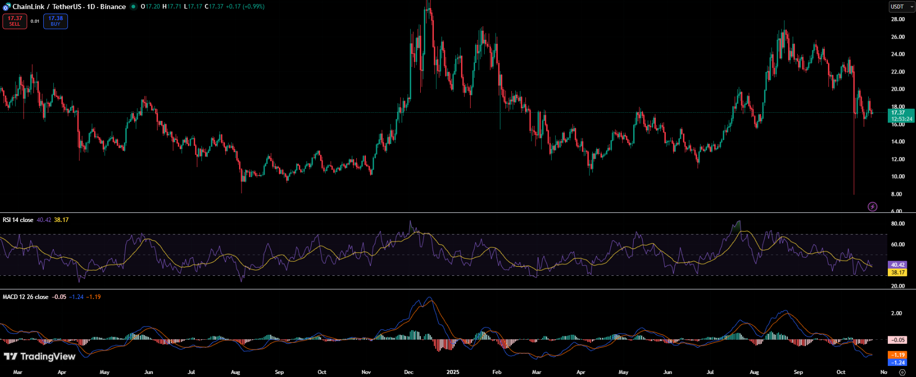 当前LINK报价17.37美元,较年内高点26美元有所回落。但RSI指标低于40暗示超卖,日线MACD线收窄表明看跌动能减弱。作为区块链基础设施的关键组件,Chainlink持续为DeFi、衍生品和游戏生态系统提供价格数据。其跨链互操作性协议CCIP等创新,正为生态注入长期价值。